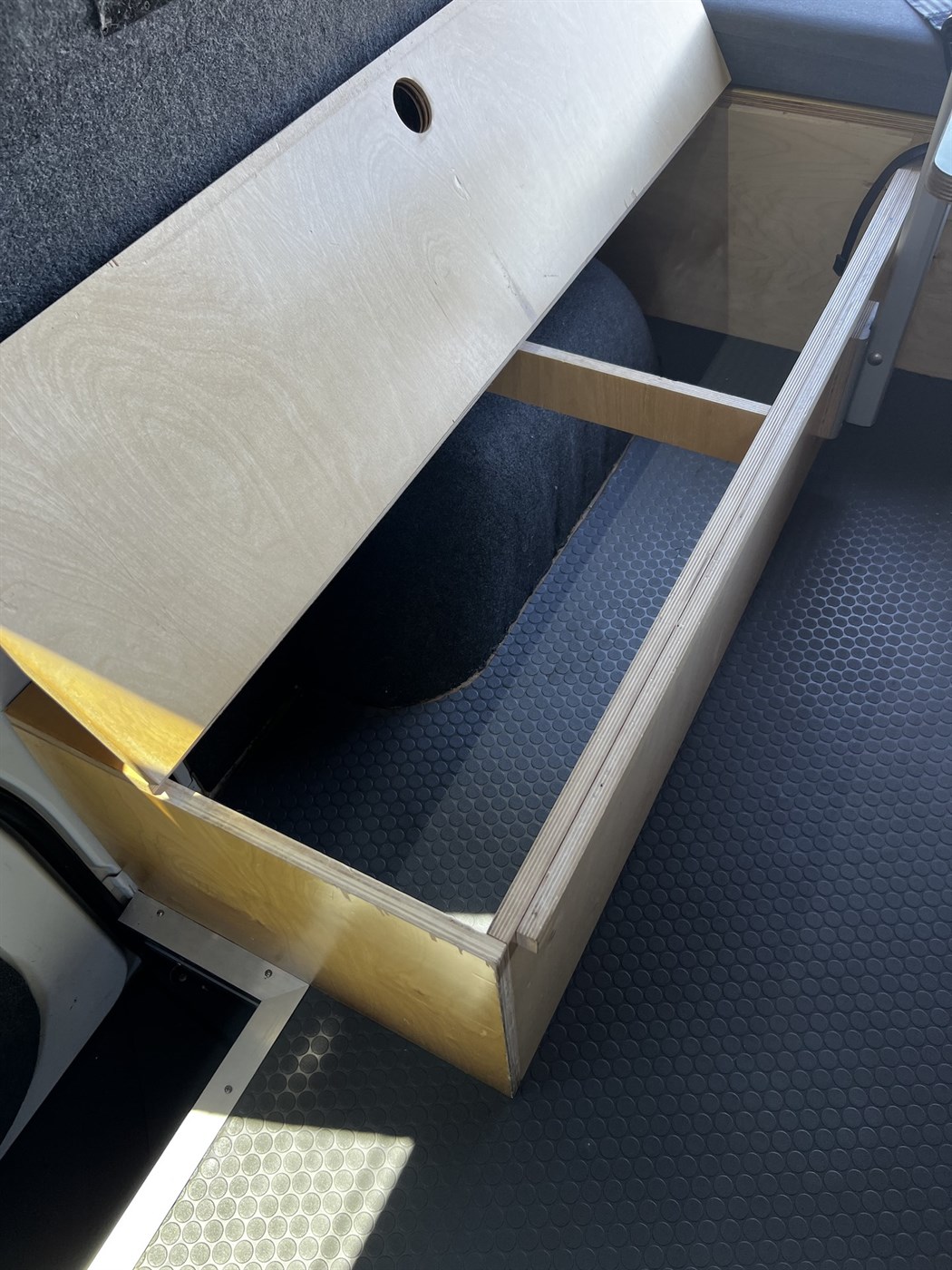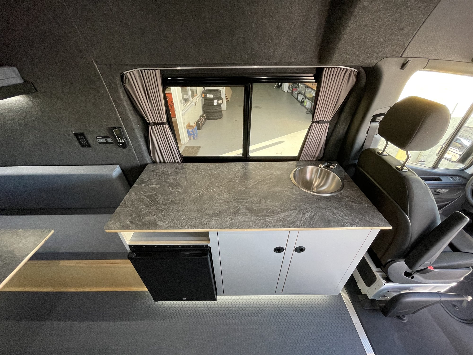 Included in the van: Roof mounted Solar Panel, Electric Power Fan on top, Two Burner Gas stove, 1,000-Watt Power Inverter with wall plug and USB outlets, Exterior Lights for night activities, Pot, Pan, Plates, Bowls, Cups, Cutleries, 4 Pillows and Cleaning Tools. A mini Fridge, a Sink with running water, refillable water tank, a grey wastewater tank, and optional use of built in heater. It has 2 seats in the front and 3 in the back. Therefore, one can drive while the rest of the group plays poker in the back.